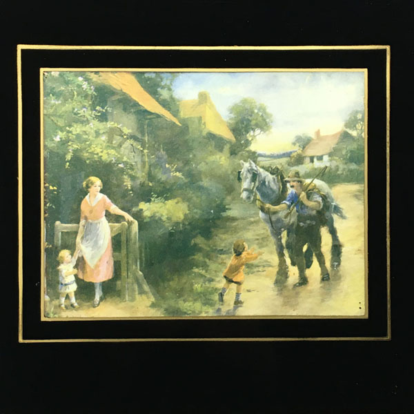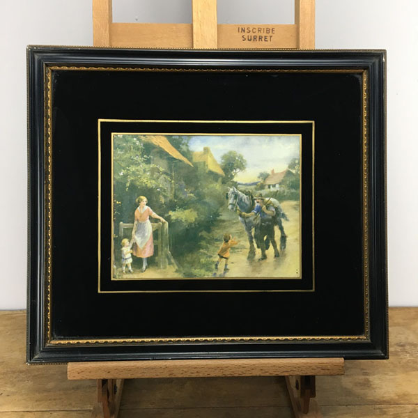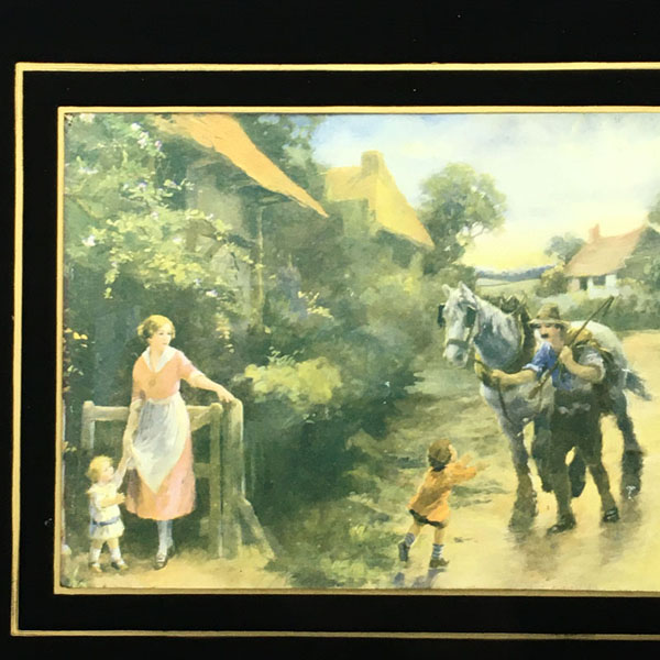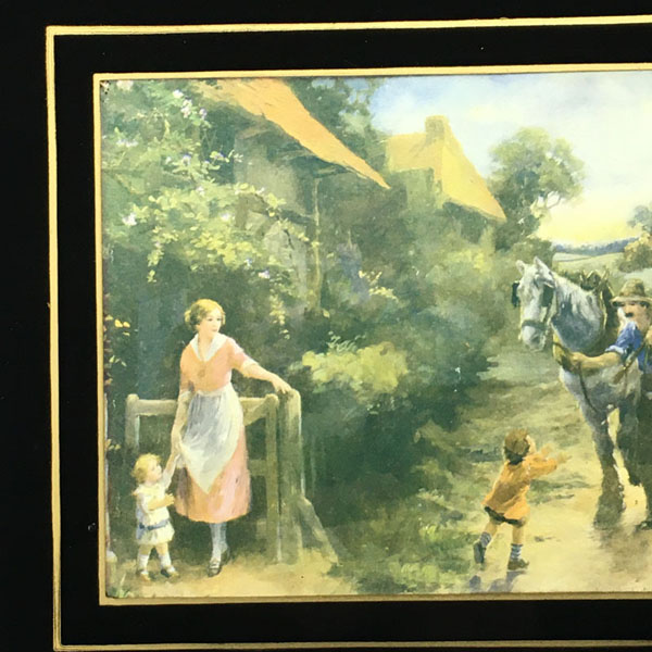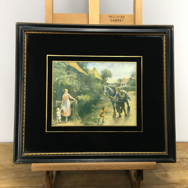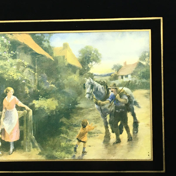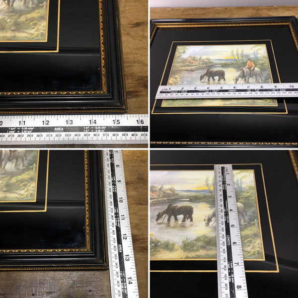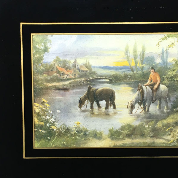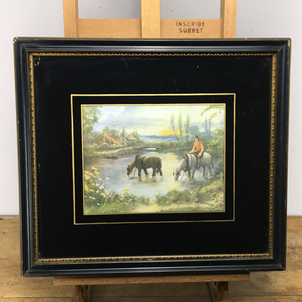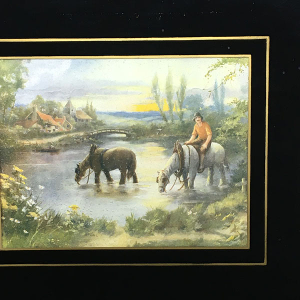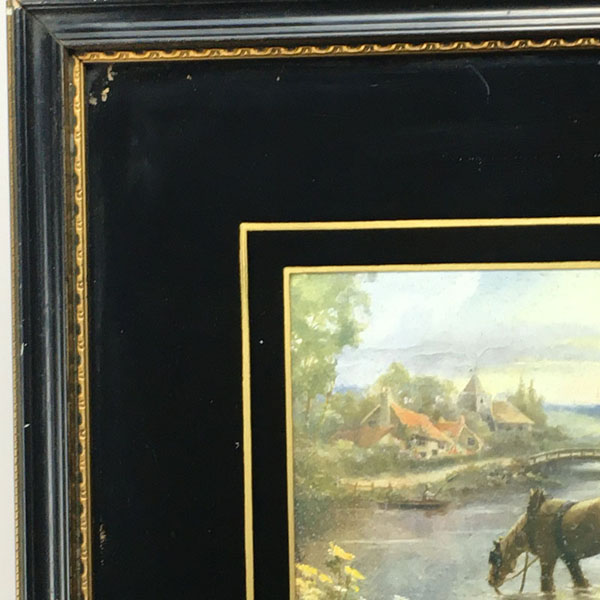 A Pair of antique prints showing rustic themes presented in ebonised Verre Eglomise frames that show a back-painted thick black border edged with double fine gilt lines.