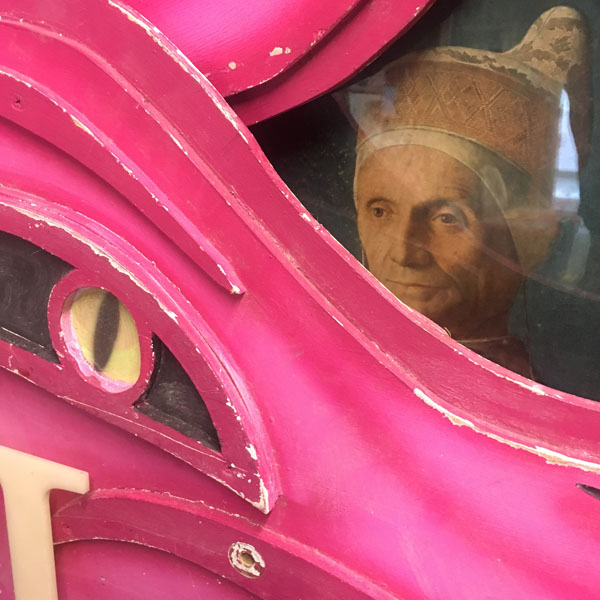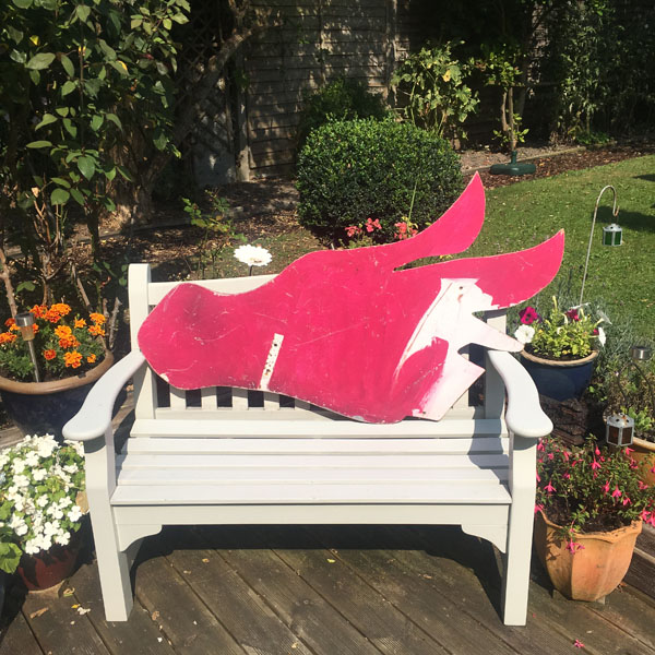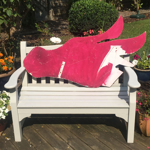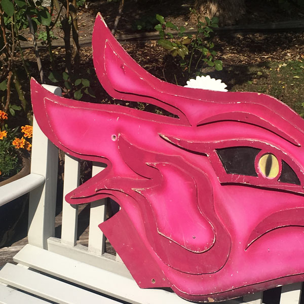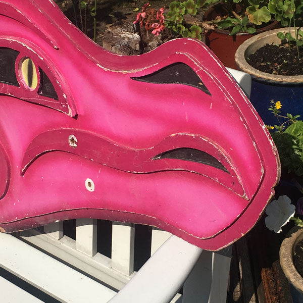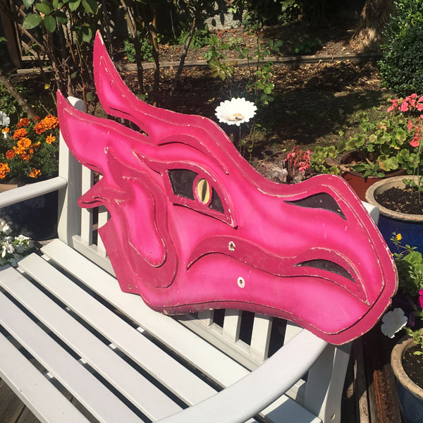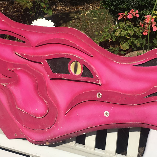 One of a pair of large layered and brightly painted wooden dragons heads that come (by repute) from the amusement arcade on Weston Super Mare Pier.