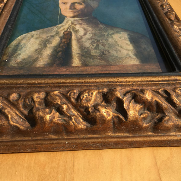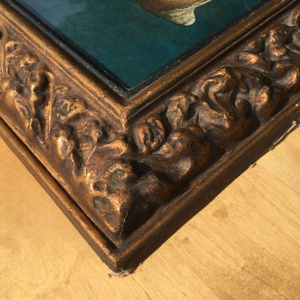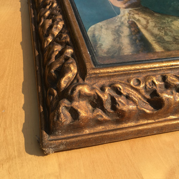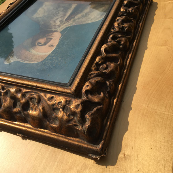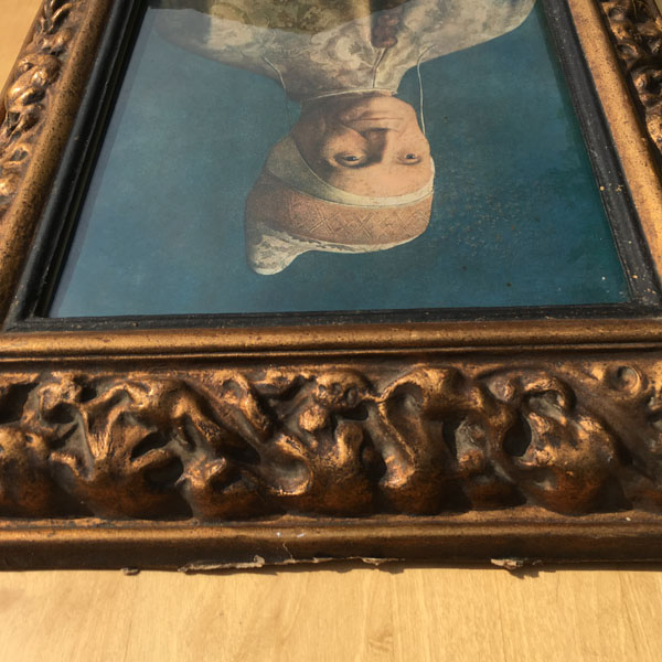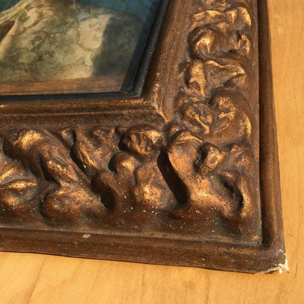 The frame appears to be made of moulded paper or paper-mâché that has a golden gilt finish. There are signs of wear to the frame that can be clearly seen in the photographs and add a certain charm and authenticity to the piece as a whole.