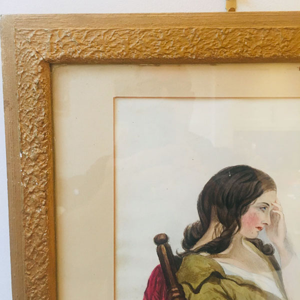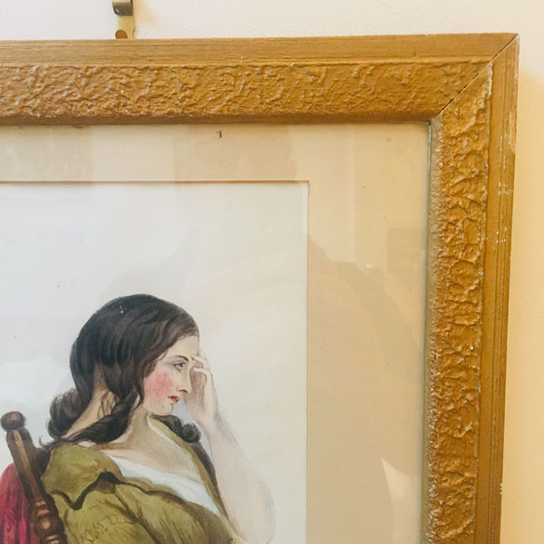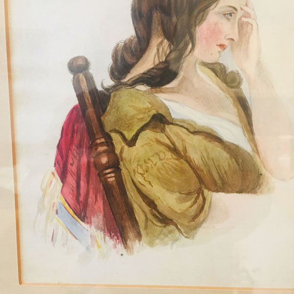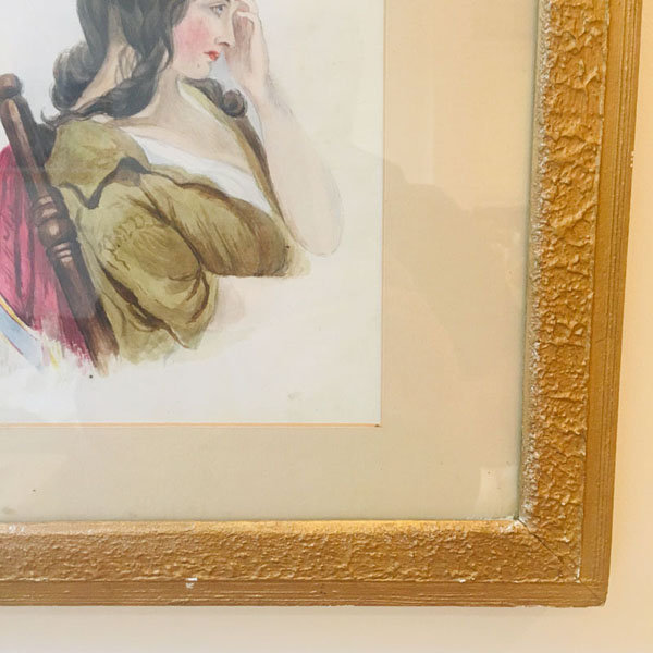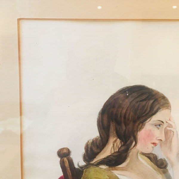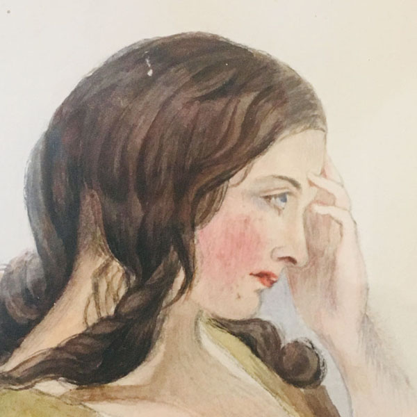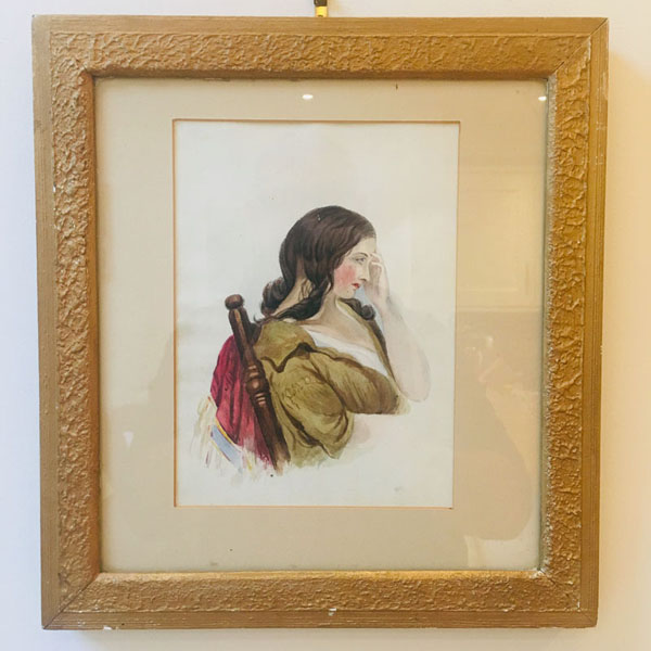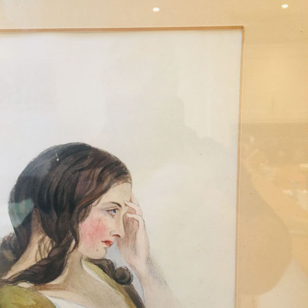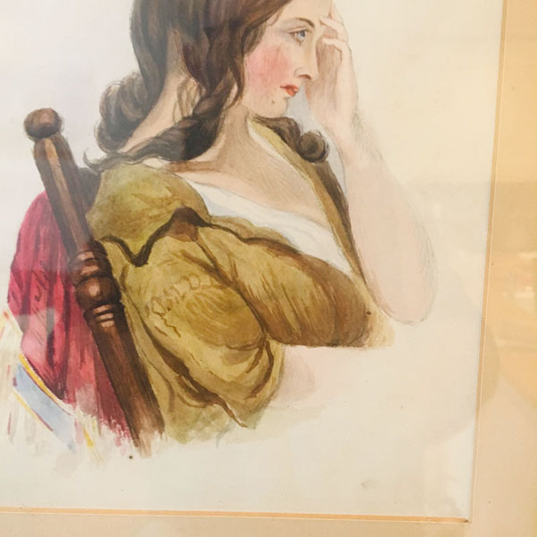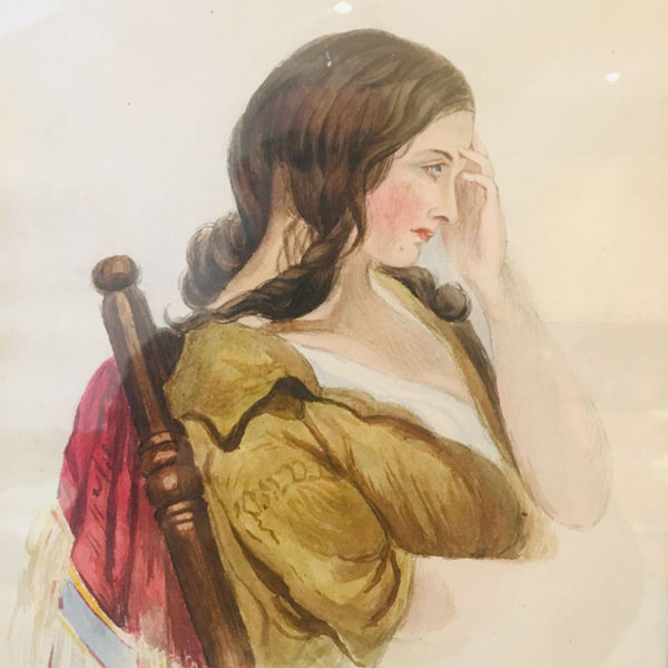 An early 19th century watercolour of a seated lady deep in her own thoughts with long flowing dark hair and colour in her cheeks.