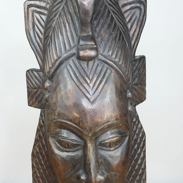 An original carved wooden head piece that is freestanding but flat-backed so that it could be hung on a wall. There is a wire attached to do so.