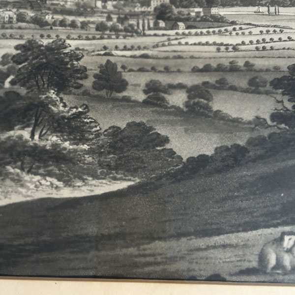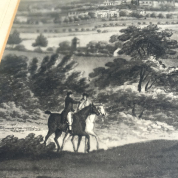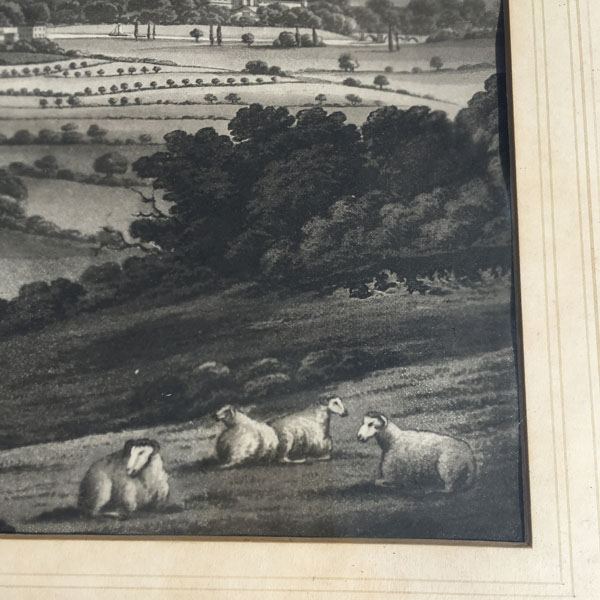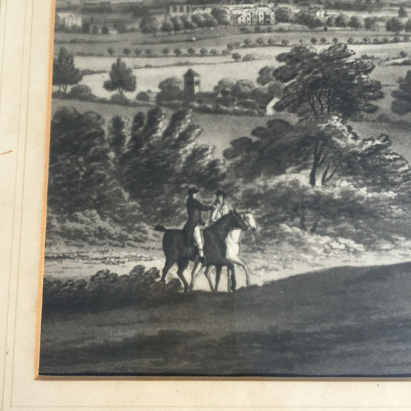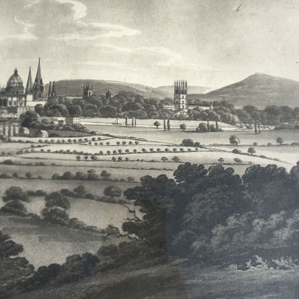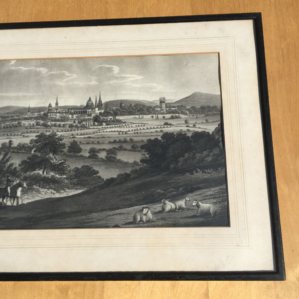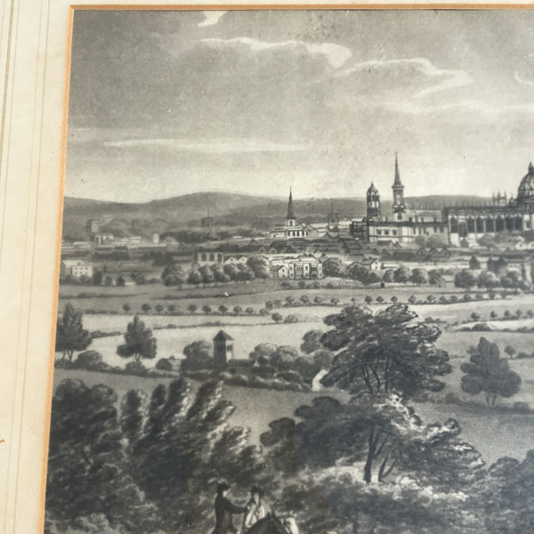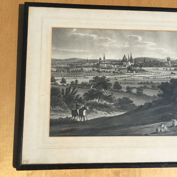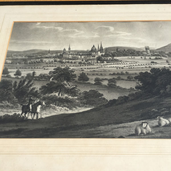 An original antique etching believed to pre-date the 1830’s that shows an early view of Oxford possibly as seen from Ferry Hinksey Hill, across fields that contain two horse riders and a flock of sheep.