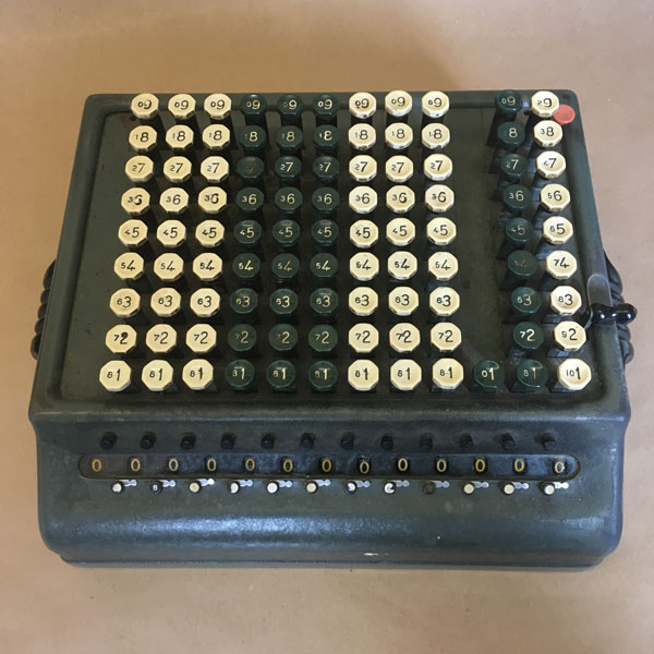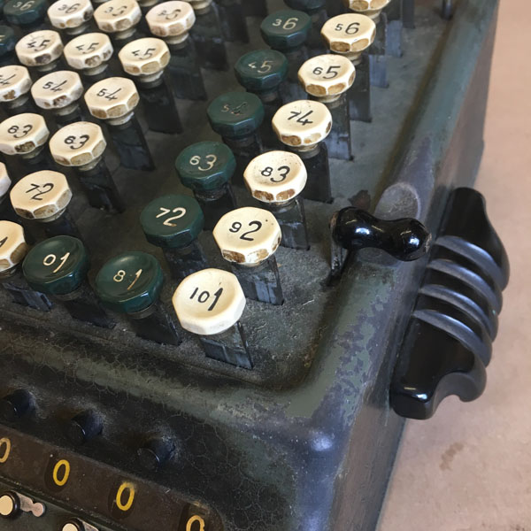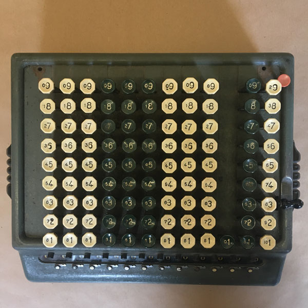 You will see it has 9 decades of £ keys, with columns on the right for shillings and pence keys. The pence column is abbreviated to 1 to 9. To enter a number 10 or 11 two keys have to be pressed in succession in that column to give the required number. The lever on the right is for clearing the total.