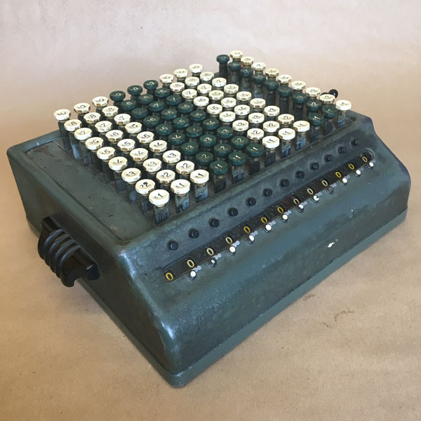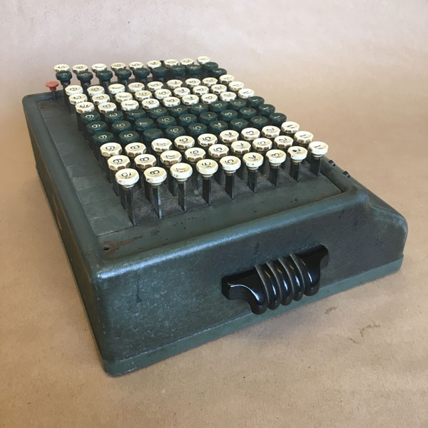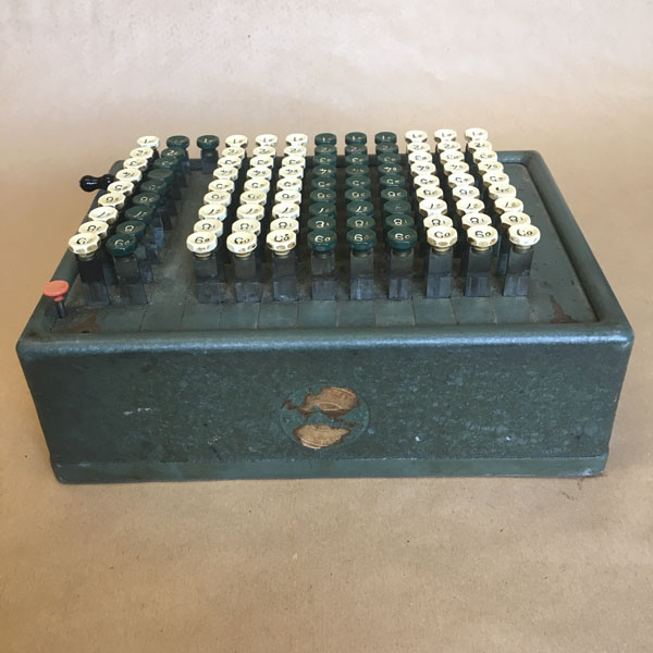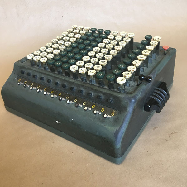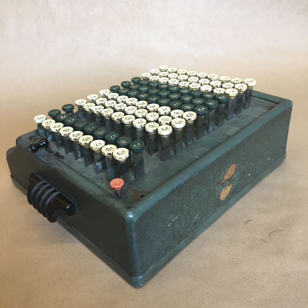This is an interesting earlier model that has octagonal buttons not round ones – as in later models and it does not feature the large Sumlock name plate on the front of the machine – this again appeared in later models.