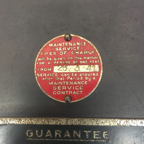 The machine is in good shape for its age (1941) There is a red disk on the underside that states “Maintenance Service – Free of Charge” from the production date that is stamped into the disk “26 – 3 – 41” – on the back are the remains of the original “Sumlock” logo disk.