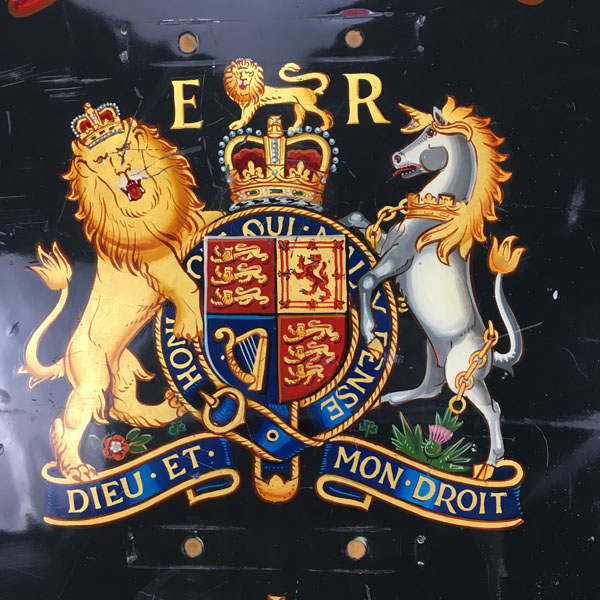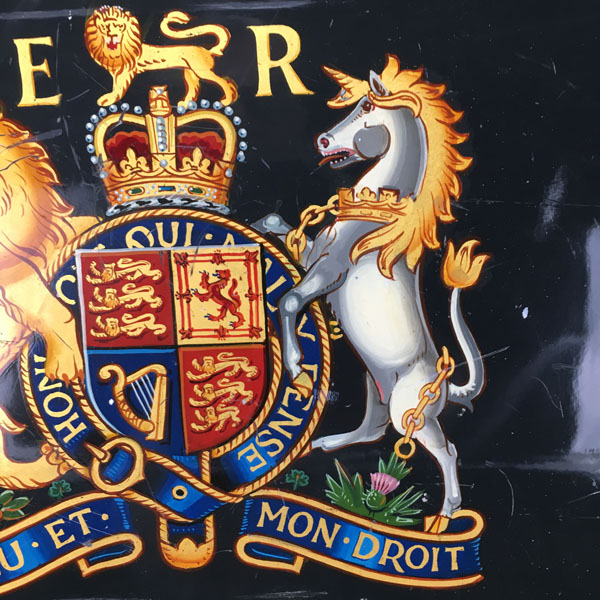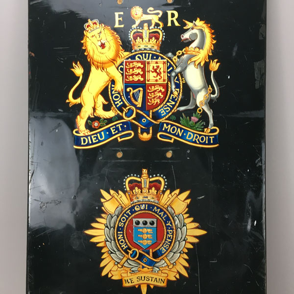 A highly decorative piece with the regiment’s badge and coat of arms clearly displayed in the centre, with the Corps name written on scrolls at the top and further scroll work overlaying a wreath with the names Peninsula, Waterloo, Taku Forts, Pekin and Lucknow applied. There is some wear to the top right hand corner.