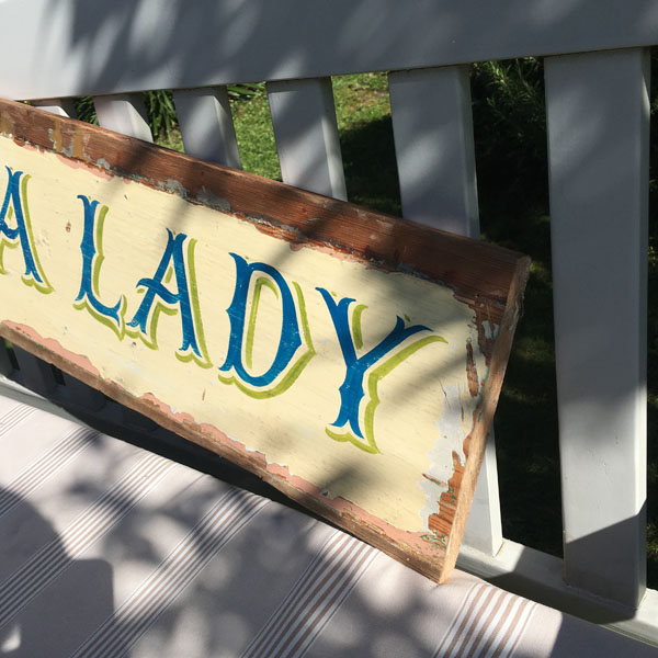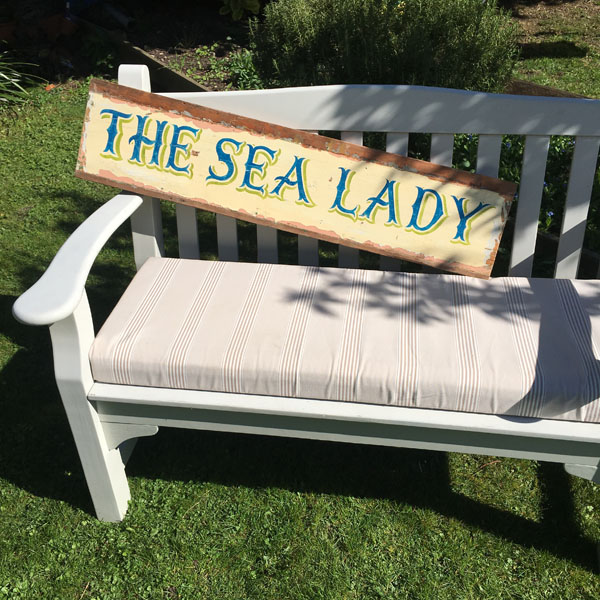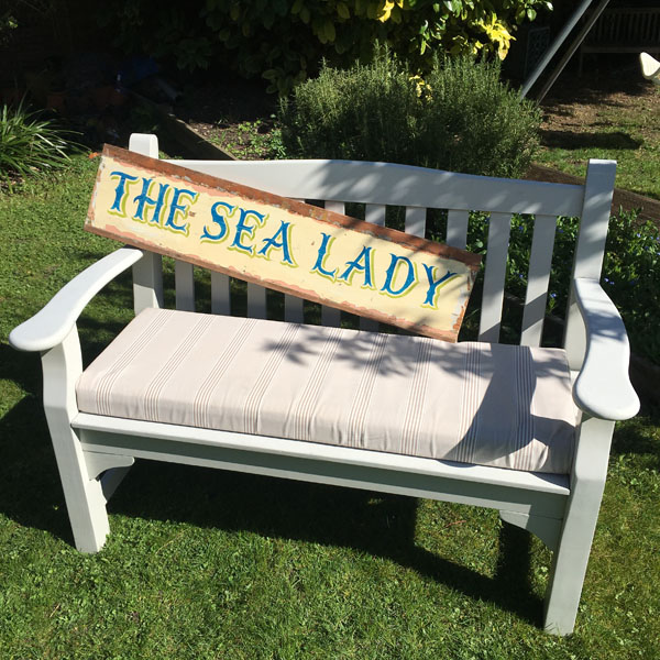 An original hand painted sign that reads The Sea Lady. This is a large and very study / heavy piece that will be a statement in any setting. Painted on reclaimed wood by a professional sign-writer of some 30+ years as a decorative interior piece for any setting.